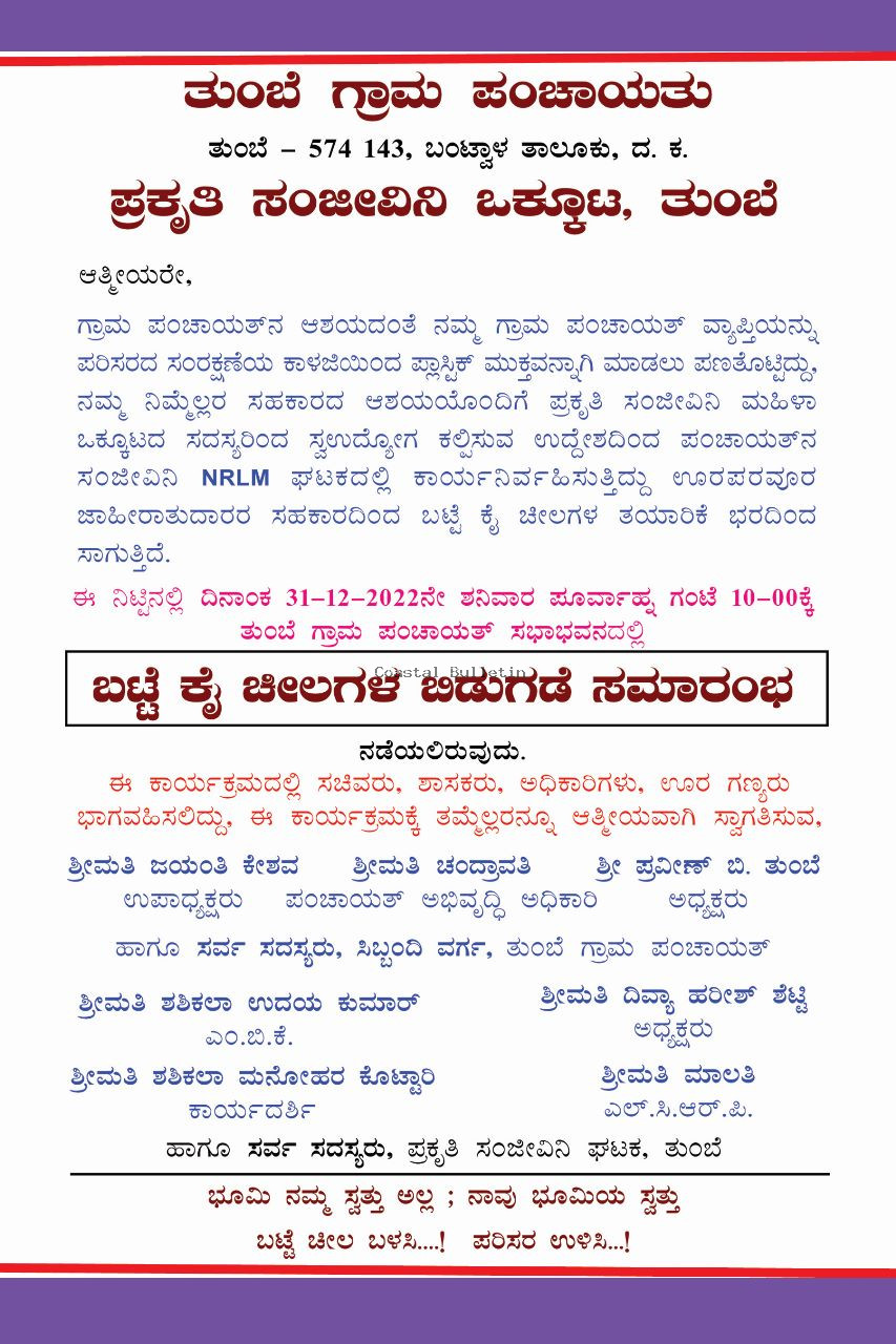 ಬಂಟ್ವಾಳ :ತುಂಬೆ ಗ್ರಾಮ ಪಂಚಾಯತ್ ಹಾಗೂ ಪ್ರಕೃತಿ ಸಂಜೀವಿನಿ ಒಕ್ಕೂಟ ತುಂಬೆ ವತಿಯಿಂದ ಡಿ.31 ರಂದು ಗ್ರಾಮ ಪಂಚಾಯತ್ ಸಭಾಭವನದಲ್ಲಿ ಬಟ್ಟೆ ಕೈ ಚೀಲಗಳ ಬಿಡುಗಡೆ ಸಮಾರಂಭ ನಡೆಯಲಿದೆ.