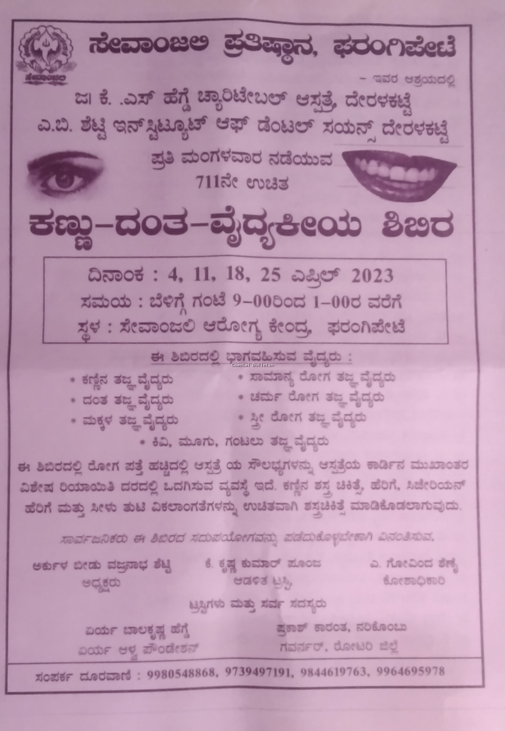 ಬಂಟ್ವಾಳ: ಸೇವಾಂಜಲಿ ಪ್ರತಿಷ್ಠಾನ, ಫರಂಗಿಪೇಟೆ ಇವರ ಆಶ್ರಯದಲ್ಲಿ ಜ,ಕೆ ಎಸ್ ಹೆಗ್ಡೆ ಚಾರಿಟೇಬಲ್ ಆಸ್ಪತ್ರೆ ಹಾಗೂ ಎ ಬಿ ಶೆಟ್ಟಿ ಇನ್ಸ್ಟಿಟ್ಯೂಟ್ ಅಪ್ ಡೆಂಟಲ್ ಸಯೆನ್ಸ್ ದೇರಳಕಟ್ಟೆ ಇವರಿಂದ ತಿಂಗಳ ಪ್ರತಿ ಮಂಗಳವಾರ ನಡೆಯುವ 711 ನೇ ಉಚಿತ ಕಣ್ಣು- ದಂತ- ವೈದ್ಯಕೀಯ ಶಿಬಿರವು ಎ.4,11,18, 25 ರಂದು ಸೇವಾಂಜಲಿ ಆರೋಗ್ಯ ಕೇಂದ್ರದಲ್ಲಿ ಬೆಳಿಗ್ಗೆ 9ರಿಂದ ಮದ್ಯಾಹ್ನ 1ರ ವರೆಗೆ ನಡೆಯಲಿದೆ ನಡೆಯಲಿದೆ.