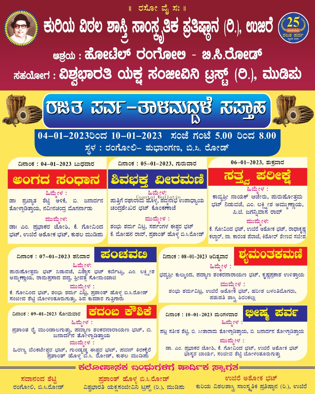 ಬಂಟ್ವಾಳ :ಧರ್ಮಸ್ಥಳದ ಧರ್ಮಾಧಿಕಾರಿ ಡಾ. ವೀರೇಂದ್ರ ಹೆಗ್ಗಡೆಯವರ ಕೃಪಾಶೀರ್ವಾದಗಳೊಂದಿಗೆ,ಕುರಿಯ ವಿಠಲ ಶಾಸ್ತ್ರಿ ಸಾಂಸ್ಕೃತಿಕ ಪ್ರತಿಷ್ಠಾನ ರಿ,ಉಜಿರೆ ಇದರ ರಜತಪರ್ವ- ಶತಕ ತಾಳಮದ್ದಳೆ ಸಪ್ತಾಹ ಸರಣಿ ಜ.4ರಿಂದ 10ತನಕ ಬಿ. ಸಿ. ರೋಡಿನ ಹೋಟೆಲ್ ರಂಗೋಲಿ ಸಭಾಭಾವನದಲ್ಲಿ ನಡೆಯಲಿದೆ.