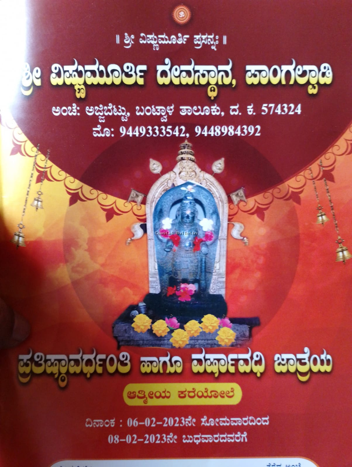 ಬಂಟ್ವಾಳ: ತಾಲೂಕಿನ ಅಜ್ಜಿಬೆಟ್ಟು ಗ್ರಾಮದ ಪಾಂಗಲ್ಪಾಡಿ ಶ್ರೀವಿಷ್ಣುಮೂರ್ತಿ ದೇವಸ್ಥಾನದ ಪ್ರತಿಷ್ಠಾ ವರ್ಧಂತಿ ಹಾಗೂ ವರ್ಷಾವಧಿ ಜಾತ್ರೆಯು ವಿವಿಧ ವೈದಿಕ,ಧಾರ್ಮಿಕ ಸಾಂಸ್ಕೃತಿಕ ಕಾರ್ಯಕ್ರಮದೊಂದಿಗೆ ಫೆ.6ರಿಂದ ಫೆ.8ರವರೆಗೆ ನಡೆಯಲಿದೆ ಎಂದು ದೇವಳದ ವ್ಯವಸ್ಥಾಪನಾ ಸಮಿತಿ ಅಧ್ಯಕ್ಷ ಡಾ.ರಾಮಕೃಷ್ಣ ಎಸ್.ಅವರು ಪ್ರಕಟನೆಯಲ್ಲಿ ತಿಳಿಸಿದ್ದಾರೆ