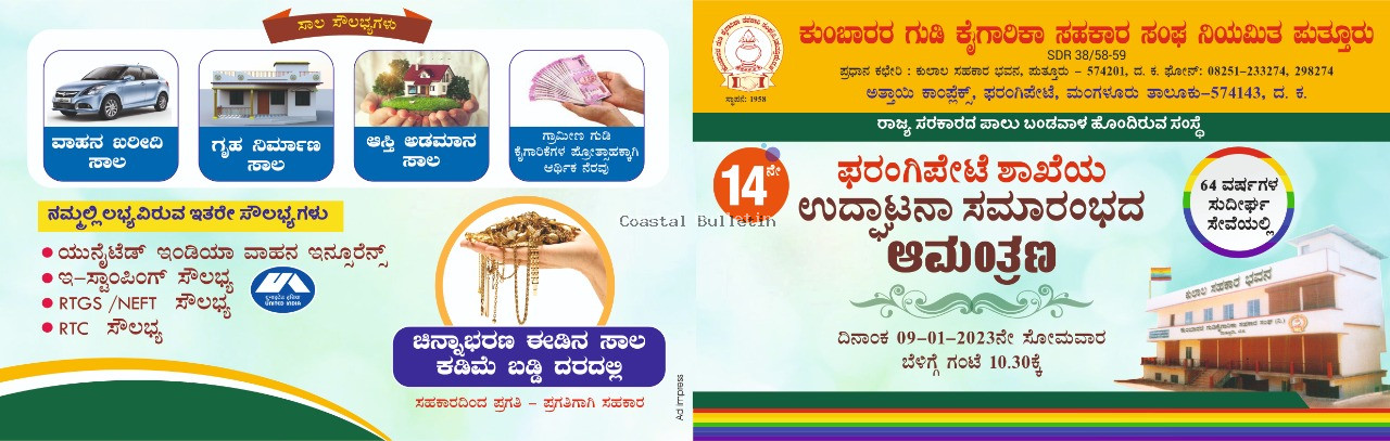ಫರಂಗಿಪೇಟೆ : ಕುಂಬಾರರ ಗುಡಿ ಕೈಗಾರಿಕಾ ಸಹಕಾರ ಸಂಘ ನಿಯಮಿತ ಪುತ್ತೂರು ಇದದ 14ನೇ ಶಾಖೆಯ ಶುಭಾರಂಭವು ಜ.9 ರಂದು ಅತ್ತಾಯಿ ಕಾಂಪ್ಲೆಕ್ಸ್ ಫರಂಗಿಪೇಟೆಯಲ್ಲಿ ನಡೆಯಲಿದೆ.