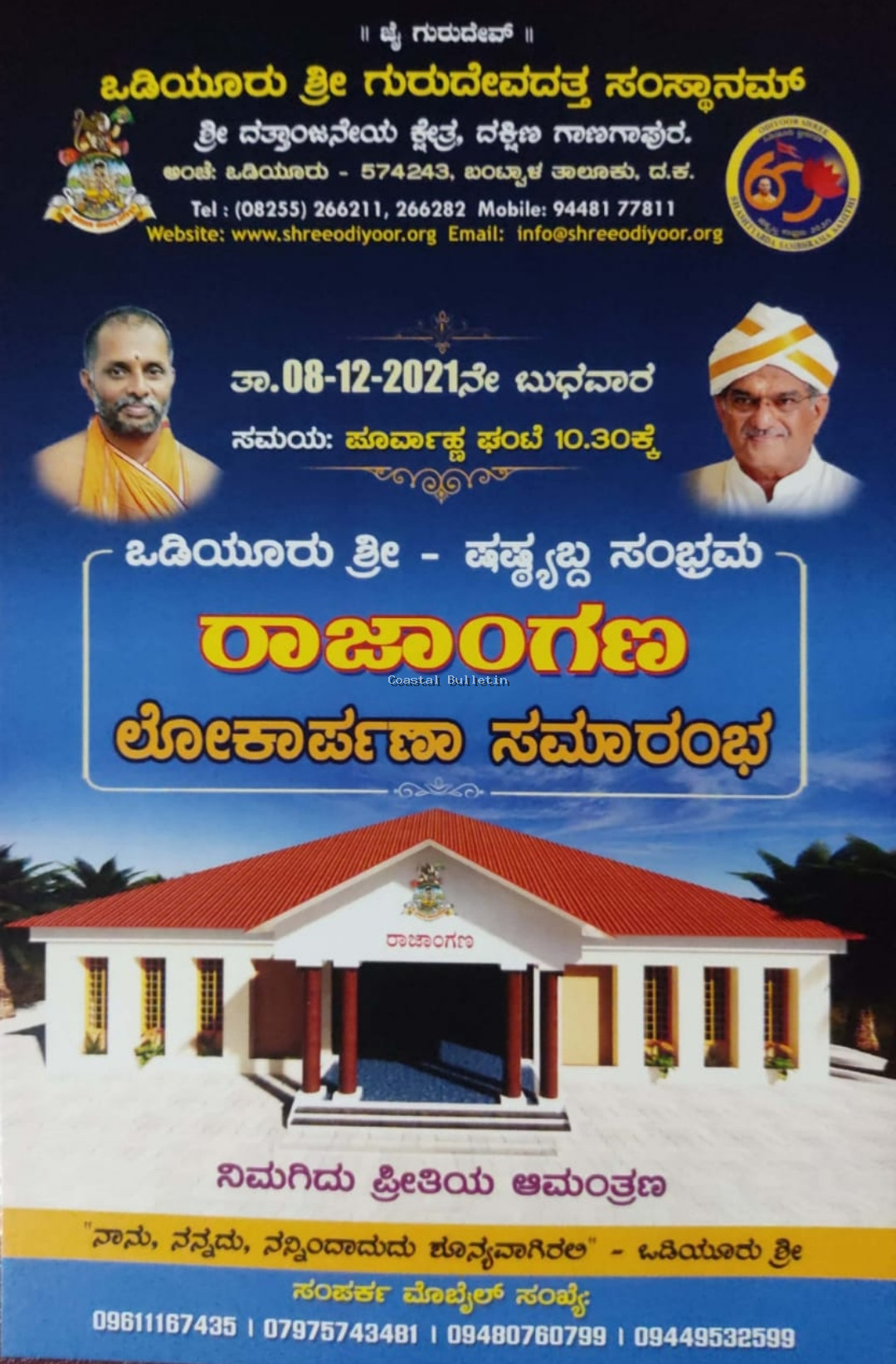 ವಿಟ್ಲ : ಒಡಿಯೂರು ಶ್ರೀ ಗುರುದೇವದತ್ತ ಸಂಸ್ಥಾನಮ್ ಶ್ರೀ ದತ್ತಾಂಜನೇಯ ಕ್ಷೇತ್ರ ದಕ್ಷಿಣ ಗಾಣಗಾಪುರ ಇಲ್ಲಿ ನಾಳೆ ತಾ.8.12.2021 ನೇ ಬುಧವಾರದಂದು ನೂತನವಾಗಿ ನಿರ್ಮಿಸಿದ ರಾಜಾಂಗಣ ಲೋಕಾರ್ಪಣಾ ಸಮಾರಂಭವು ಪೂರ್ವಾಹ್ನ ಘಂಟೆ 11.00ಕ್ಕೆ ಸರಿಯಾಗಿ ಪದ್ಮವಿಭೂಷಣ ರಾಜರ್ಷಿ ಡಿ.ವೀರೇಂದ್ರ ಹೆಗ್ಗಡೆಯವರು ನೆರವೇರಿಸಲಿದ್ದಾರೆ.ಪರಮಪೂಜ್ಯ ಶ್ರೀ ಮೋಹನದಾಸ ಪರಮಹಂಸ ಸ್ವಾಮೀಜಿ ಶ್ರೀಧಾಮ ಮಾಣಿಲ, ಸಾಧ್ವಿ ಶ್ರೀ ಮಾತಾನಂದಮಯೀ ಇವರ ದಿವ್ಯ ಉಪಸ್ಥಿತಿಯಲ್ಲಿ, ವಿದ್ವಾನ್ ಹಿರಣ್ಯ ವೆಂಕಟೇಶ್ವರ ಭಟ್ ಪ್ರಾಸ್ತಾವಿಕ ಭಾಷಣ ಮಾಡಲಿದ್ದಾರೆ.ಎಸ್.ಅಂಗಾರ, ನಳಿನ್ ಕುಮಾರ್ ಕಟೀಲು,ರಾಜೇಶ್ ನಾಯ್ಕ್ ಉಳಿಪಾಡಿಗುತ್ತು, ಸಂಜೀವ ಮಠಂದೂರು, ಪಿ.ಎಸ್. ಯಡಪಡಿತ್ತಾಯ ಆಗಮಿಸಲಿರುವರು.