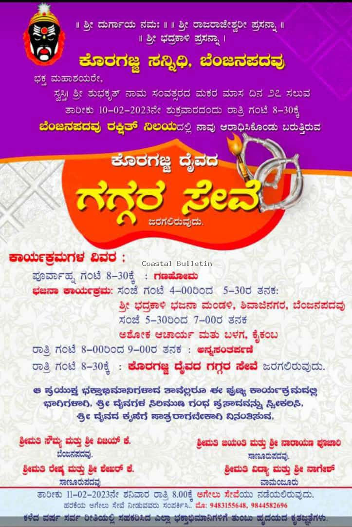 ಬಂಟ್ವಾಳ : ಕೊರಗಜ್ಜ ಸನ್ನಿಧಿ ಬೆಂಜನಪದವು ಇಲ್ಲಿನ ರಕ್ಷಿತ್ ನಿಲಯದಲ್ಲಿ ಫೆ.10 ರಂದು ಶನಿವಾರ ಕೊರಗಜ್ಜ ದೈವದ ಗಗ್ಗರ ಸೇವೆ ಜರಗಲಿದೆ.