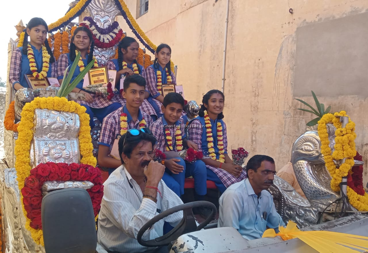 ಬಂಟ್ವಾಳ: ಶಿವಮೊಗ್ಗದಲ್ಲಿ ಇತ್ತೀಚೆಗೆ ನಡೆದ ರಾಜ್ಯಮಟ್ಟದ ಪ್ರತಿಭಾಕಾರಂಜಿ ಮತ್ತು ಕಲೋತ್ಸವದ ಸ್ಪರ್ಧೆಯಲ್ಲಿ ಭಾಗವಹಿಸಿ ಬಹುಮಾನ ಪಡೆದ ಶಾಲೆ ಹಾಗೂ ಊರಿಗೆ ಕೀರ್ತಿ ತಂದ ಬಂಟ್ವಾಳ ಎಸ್.ವಿ.ಎಸ್.ದೇವಳ ಆಂಗ್ಲ ಮಾಧ್ಯಮ ಶಾಲಾ ವಿದ್ಯಾರ್ಥಿಗಳನ್ನು ಶಾಲಾ ಆಡಳಿತ ಮಂಡಳಿ ವತಿಯಿಂದ ಮಂಗಳವಾರ ಬಂಟ್ವಾಳ ಪೇಟೆಯಲ್ಲಿ ಸಂಭ್ರಮದ ಮೆರವಣಿಗೆ ನಡೆಸಿ ಅಭಿನಂದಿಸಲಾಯಿತು.