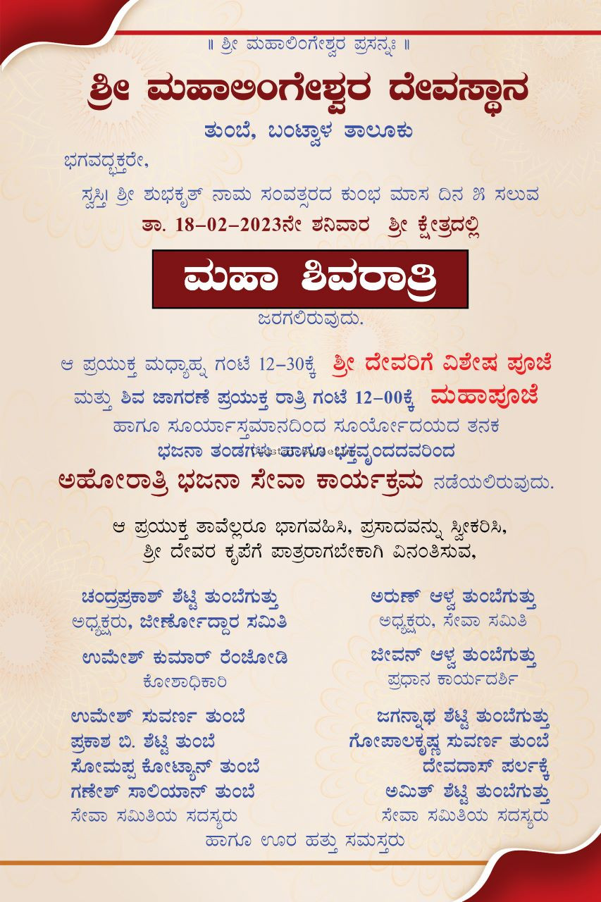 ಮಧ್ಯಾಹ್ನ 12.30 ಕ್ಕೆ ಶ್ರೀ ದೇವರಿಗೆ ವಿಶೇಷ ಪೂಜೆ ಮತ್ತು ಶಿವ ಜಾಗರಣೆ ಪ್ರಯುಕ್ತ ರಾತ್ರಿ 12 ಗಂಟೆಗೆ ಮಹಾಪೂಜೆ