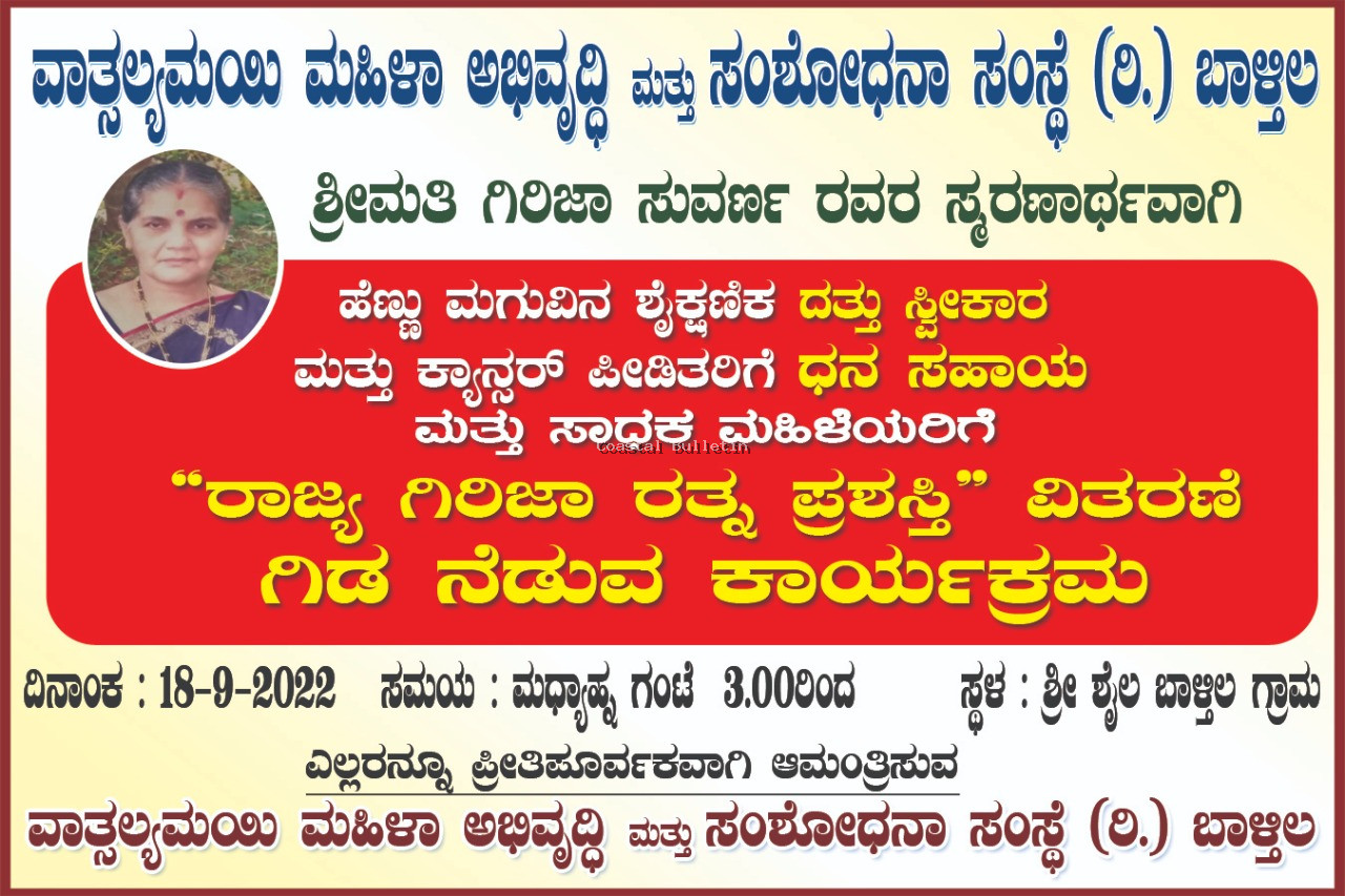 ಬಂಟ್ವಾಳ :ವಾತ್ಸಲ್ಯ ಮಯಿ ಮಹಿಳಾ ಅಭಿವೃದ್ಧಿ ಮತ್ತು ಸಂಶೋಧನಾ ಸಂಸ್ಥೆ ಬಾಳ್ತಿಲ ಇದರ ಆಶ್ರಯದಲ್ಲಿ ಶ್ರೀಮತಿ ಗಿರಿಜಾ ಸುವರ್ಣರವರ ಸ್ಮರಣಾರ್ಥ, "ಹೆಣ್ಣು ಮಗುವಿನ ಶೈಕ್ಷಣಿಕ ದತ್ತು ಸ್ವೀಕಾರ ಮತ್ತು ಕ್ಯಾನ್ಸರ್ ಪೀಡಿತರಿಗೆ ಧನ ಸಹಾಯ ಮತ್ತು ಸಾಧಕ ಮಹಿಳೆಯರಿಗೆ ರಾಜ್ಯ ಗಿರಿಜಾ ರತ್ನ ಪ್ರಶಸ್ತಿ ಪ್ರದಾನ"ಸಮಾರಂಭ ಹಾಗೂ ಗಿಡ ನೆಡುವ ಕಾರ್ಯಕ್ರಮ ಸೆ.18ರಂದು ಮಧ್ಯಾಹ್ನ 3ರಿಂದ ಬಾಳ್ತಿಲ ಗ್ರಾಮದ ಶ್ರೀ ಶೈಲದಲ್ಲಿ ನಡೆಯಲಿದೆ ಎಂದು ಸಂಸ್ಥೆಯ ಮುಖ್ಯಸ್ಥರಾದ, ಕಿತ್ತೂರು ರಾಣಿ ಚೆನ್ನಮ್ಮ ರಾಜ್ಯ ಪ್ರಶಸ್ತಿ ಪುರಸ್ಕೃತರು ಶೈಲಜಾ ರಾಜೇಶ್ ಪ್ರಕಟಣೆಯಲ್ಲಿ ತಿಳಿಸಿದ್ದಾರೆ.