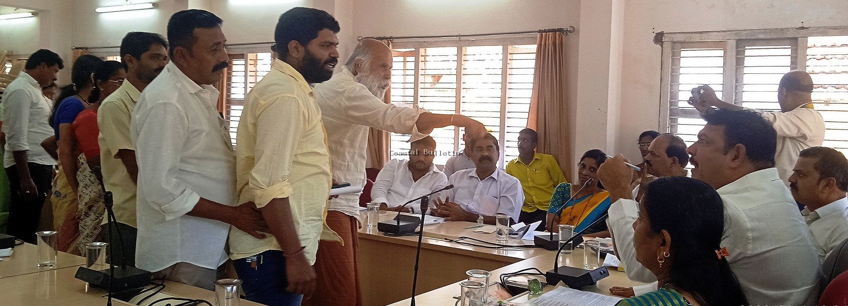 ಸದಸ್ಯ ಮುನೀಶ್ ಆಲಿ ಪುರಸಭಾಧ್ಯಕ್ಷರೊಂದಿಗೆ ಮಾತಿನ ಚಕಮಕಿ ನಡೆಸಿದರು. ಇನ್ನೊಂದೆಡೆ ಮುಖ್ಯಾಧಿಕಾರಿ ಎಂ.ಆರ್.ಸ್ವಾಮಿ ಅವರು ಗುತ್ತಿಗೆದಾರ ವಿರುದ್ಧ 'ಅಸಂವಿಧಾನಿಕ ಶಬ್ಧ' ಬಳಕೆ ಮಾಡಿರುವ ಬಗ್ಗೆ ಸದಸ್ಯ ಮುನೀಶ್ ಆಲಿ ಖಂಡಿಸಿದರು. ಈ ನಡುವೆ ಆಡಳಿತ ಪಕ್ಷ (ಕಾಂಗ್ರೆಸ್) ಸದಸ್ಯರಾದ ಪಿ.ರಾಮಕೃಷ್ಣ ಆಳ್ವ, ವಾಸು ಪೂಜಾರಿ, ಗಂಗಾಧರ ಪೂಜಾರಿ ಮತ್ತಿತರರು ಪ್ರತಿಭಟನಾಕಾರರೊಂದಿಗೆ ಮಾತುಕತೆ ನಡೆಸಿ, ಇದೀಗ ಪ್ರತಿಭಟನೆ ಕೈಬಿಡಿ. ಮುಂದಿನ ಒಂದು ತಿಂಗಳೊಳಗೆ ಗುತ್ತಿಗೆದಾರರ ವಿರುದ್ಧ ಕ್ರಮ ಕೈಗೊಳ್ಳದಿದ್ದಲ್ಲಿ ನಿಮ್ಮೊಂದಿಗೆ ನಾವೂ ಕೈ ಜೋಡಿಸಲು ಸಿದ್ಧ ಎಂದು ಮನವೊಲಿಸಲು ಯತ್ನಿಸಿದರು. ಮುಖ್ಯಾಧಿಕಾರಿ ಎಂ.ಆರ್.ಸ್ವಾಮಿ ಸ್ವತಃ ಬಂದು ಪ್ರತಿಭಟನಾಕಾರರಲ್ಲಿ ಕ್ಷಮೆಯಾಚಿಸಿದರೂ ಬಗ್ಗಲಿಲ್ಲ. ಇದರಿಂದ ಸಭೆಯನ್ನು ಮಂಗಳವಾರಕ್ಕೆ ಮುಂದೂಡಿರುವುದಾಗಿ ಪುರಸಭಾಧ್ಯಕ್ಷರು ಪ್ರಕಟಿಸಿದರು. ಸದಸ್ಯರಾದ ಮಹಮ್ಮದ್ ನಂದರಬೆಟ್ಟು, ಜನಾರ್ದನ ಚೆಂಡ್ತಿಮಾರ್, ಲುಕ್ಮಾನ್ ಕೈಕಂಬ, ಸಿದ್ದಿಕ್, ಇದ್ರಿಸ್, ಝೀನತ್ ಮತ್ತಿತರರು ಚಚರ್ೆಯಲ್ಲಿ ಪಾಲ್ಗೊಂಡರು.