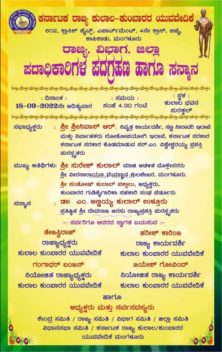 ಮಂಗಳೂರು : ಕರ್ನಾಟಕ ರಾಜ್ಯ ಕುಲಾಲ-ಕುಂಬಾರರ ಯುವವೇದಿಕೆ ವತಿಯಿಂದ ರಾಜ್ಯ, ವಿಭಾಗ, ಜಿಲ್ಲಾ ಪದಾಧಿಕಾರಿಗಳ ಪದಗ್ರಹಣ ಹಾಗೂ ಸನ್ಮಾನ ಕಾರ್ಯಕ್ರಮವು ಸುರತ್ಕಲ್ ಕುಲಾಲ ಭವನದಲ್ಲಿ ಸೆ 18ರಂದು ಆದಿತ್ಯವಾರ ನಡೆಯಲಿದೆ.