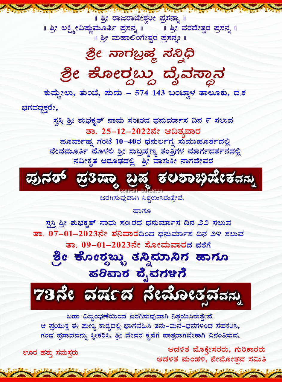 ಕುಮ್ಡೇಲು:ಶ್ರೀ ಕೋರ್ದಬ್ಬು ದೇವಸ್ಥಾನ, ಶ್ರೀ ನಾಗಬ್ರಹ್ಮ ಸನ್ನಿಧಿಯಲ್ಲಿ ಶ್ರೀ ನಾಗದೇವರ ಪುನರ್ ಪ್ರತಿಷ್ಠಾ ಬ್ರಹ್ಮಕಲಶಾಭೀಷೇಕವು ಡಿ.24 ಮತ್ತು 25 ರಂದು ನಡೆಯಲಿದೆ.