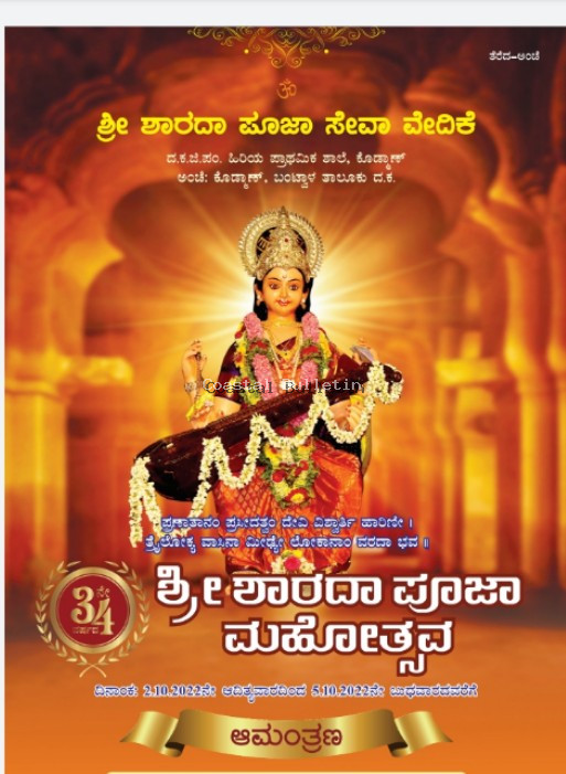 ಬಂಟ್ವಾಳ : ಶ್ರೀ ಶಾರದಾ ಪೂಜಾ ಸೇವಾ ವೇದಿಕೆ ಕೊಡ್ಮಾಣ್, ಇದರ ಆಶ್ರಯದಲ್ಲಿ ಶ್ರೀ ಶಾರದಾ ಪೂಜಾ ಮಹೋತ್ಸವು ಅ.2 ರಿಂದ 5 ರವರೆಗೆ ದ ಕ ಜಿ ಪ ಹಿರಿಯ ಪ್ರಾಥಮಿಕ ಶಾಲೆಯ ಕೊಡ್ಮಾಣ್ ಇಲ್ಲಿನ ಶಾರದಾ ಮಂಟಪದಲ್ಲಿ ನಡೆಯಲಿದೆ.