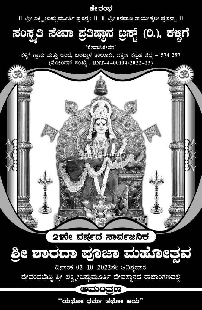 ಕಳ್ಳಿಗೆ : ಬಂಟ್ವಾಳ ತಾಲೂಕಿನ ಕಳ್ಳಿಗೆಯ ಸಂಸ್ಕೃತಿ ಸೇವಾ ಪ್ರತಿಷ್ಠಾನ ಟ್ರಸ್ಟ್ (ರಿ)ಇದರ ಆಶ್ರಯದಲ್ಲಿ ಅ.2 ರಂದು 21 ನೇ ವರ್ಷದ ಸಾರ್ವಜನಿಕ ಶ್ರೀ ಶಾರದಾ ಪೂಜಾ ಮಹೋತ್ಸವವು ಧಾರ್ಮಿಕ ಹಾಗೂ ಸಾಂಸ್ಕೃತಿಕ ಕಾರ್ಯಕ್ರಮಗಳೊಂದಿಗೆ ದೇವಂದಬೆಟ್ಟು ಶ್ರೀ ಲಕ್ಷ್ಮೀ ವಿಷ್ಣುಮೂರ್ತಿ ದೇವಸ್ಥಾನ ರಾಜಾಂಗಣದಲ್ಲಿ ವಿಜೃಂಭಣೆಯಿಂದ ನಡೆಯಲಿದೆ.