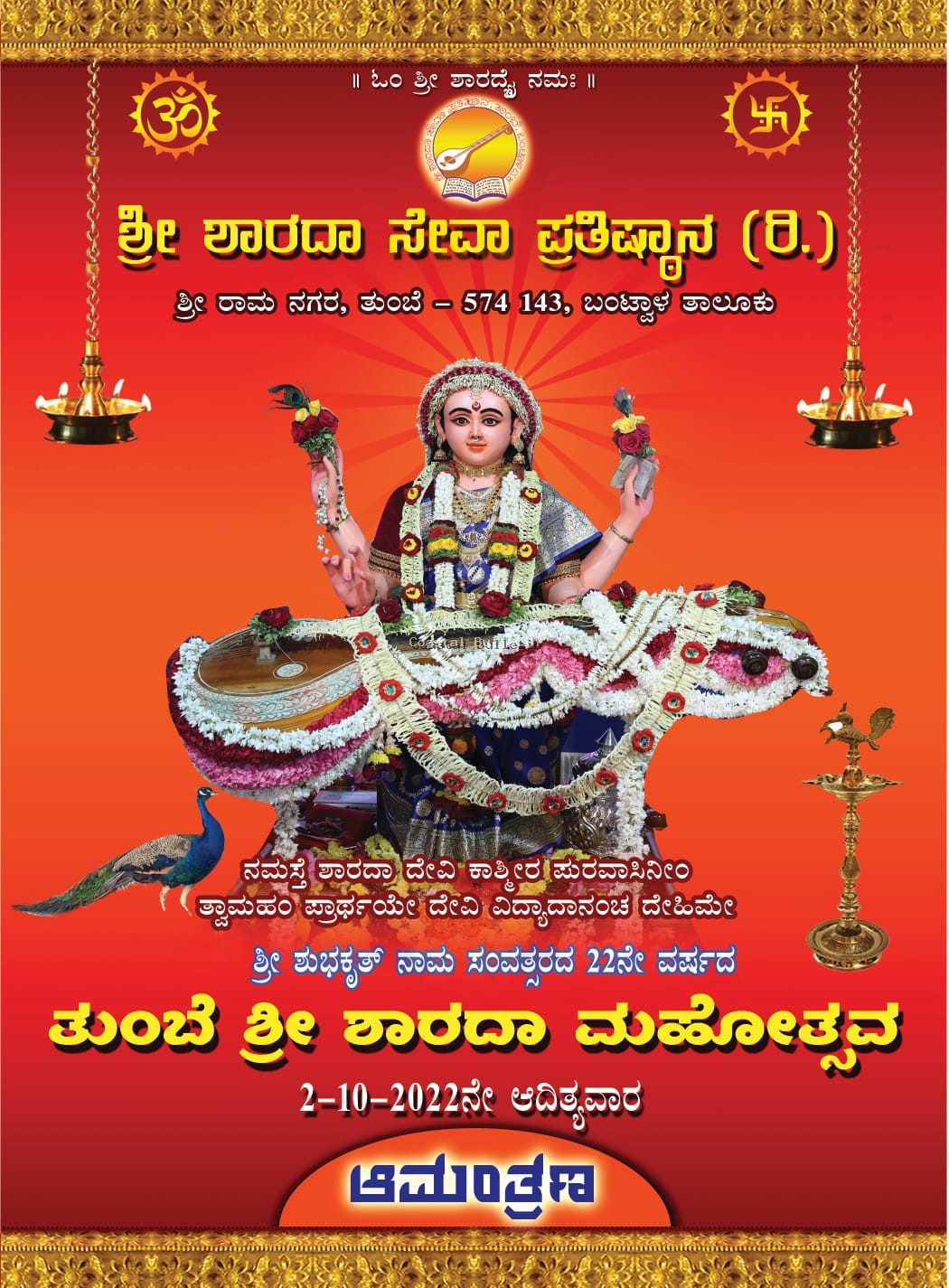 ತುಂಬೆ : ಬಂಟ್ವಾಳ ತಾಲ್ಲೂಕಿನ ತುಂಬೆಯಲ್ಲಿ ಶ್ರೀ ಶಾರದಾ ಸೇವಾ ಪ್ರತಿಷ್ಠಾನ ವತಿಯಿಂದ 22ನೇ ವರ್ಷದ ಸಾರ್ವಜನಿಕ ಶ್ರೀ ಶಾರದಾ ಮಹೋತ್ಸವವು ಅ.2 ರಂದು ಶ್ರೀ ರಾಮ ನಗರ ತುಂಬೆಯಲ್ಲಿ ನಡೆಯಲಿದೆ.