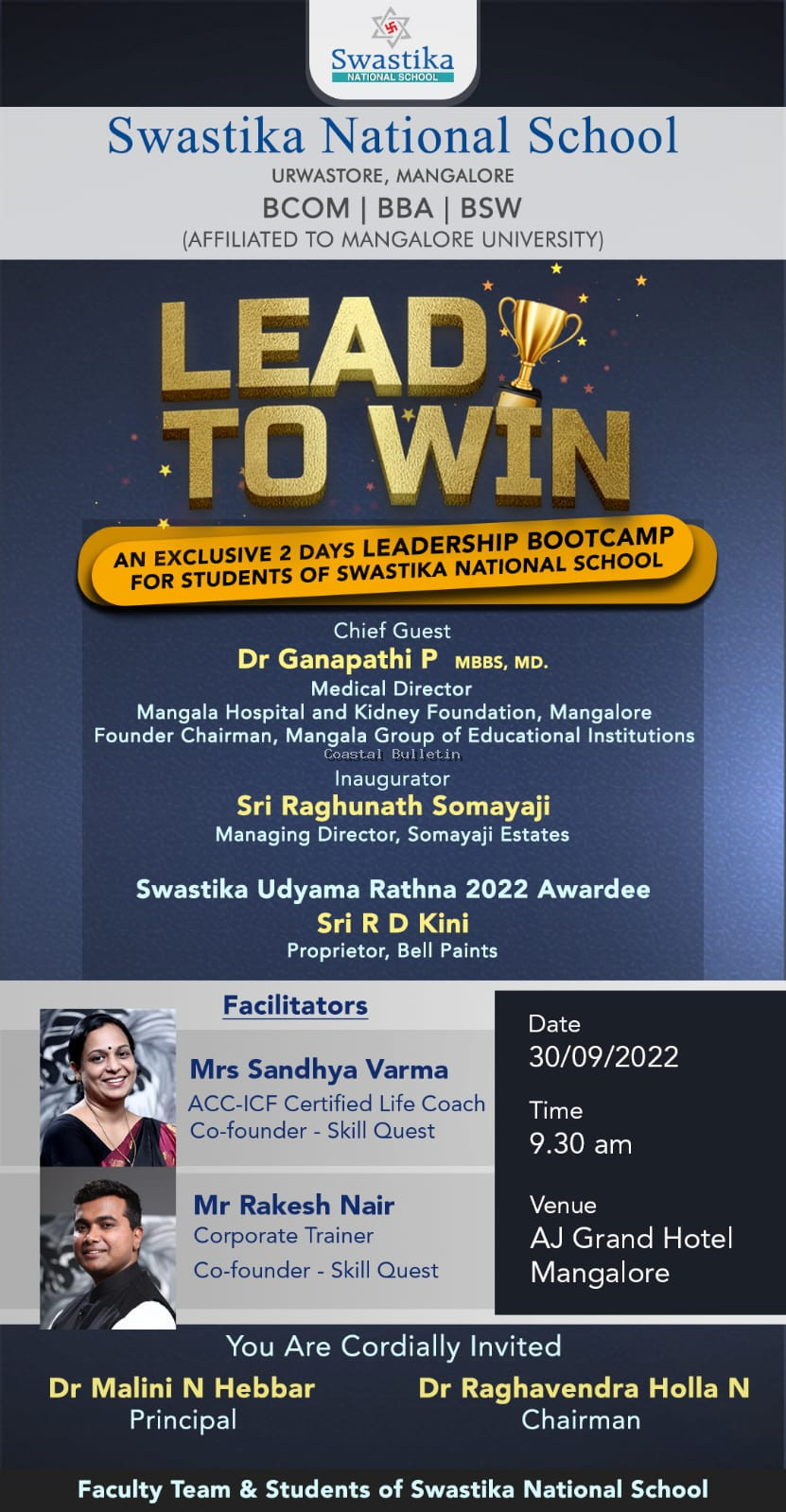 ಮಂಗಳೂರು :ಸ್ವಸ್ತಿಕ ನ್ಯಾಶನಲ್ ಸ್ಕೂಲ್ ಊರ್ವಸ್ಟೋರ್ ಇದರ ಆಶ್ರಯದಲ್ಲಿ 2 ದಿನಗಳ "ಲೀಡ್ ಟು ವಿನ್ "ಸ್ವಸ್ತಿಕ ಲೀಡರ್ಶಿಪ್ ಬೂಟ್ಕ್ಯಾಂಪ್ - 2022ಎಂಬ ಕಾರ್ಯಾಗಾರದ ಉದ್ಘಾಟನಾ ಸಮಾರಂಭವು 30ನೇ ,ಶುಕ್ರವಾರ ಬೆಳಿಗ್ಗೆ 9.30ಯಿಂದ,ಹೋಟೆಲ್ ಎಜೆ ಗ್ರ್ಯಾಂಡ್, ಮಂಗಳೂರು ನಲ್ಲಿ ನಡೆಯಲಿದೆ.