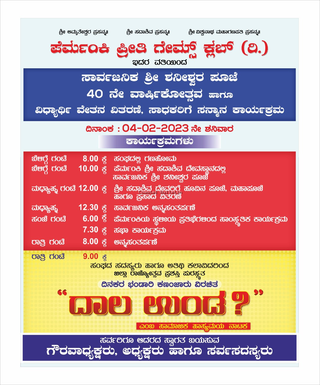ಫೆ.4 ರಂದು ಬೆಳಗ್ಗೆ 8 ಗಂಟೆಗೆ ಸಂಘದಲ್ಲಿ ಗಣಹೋಮ . ನಂತರ ಪೆರ್ಮಂಕಿ ಶ್ರೀ ಸದಾಶಿವ ದೇವಸ್ಥಾನದಲ್ಲಿ ಸಾರ್ವಜನಿಕ ಶ್ರೀ ಶನೀಶ್ವರ ಪೂಜೆ, ಹೂವಿನ ಪೂಜೆ, ಮಹಾಪೂಜೆ ಮತ್ತು ಪ್ರಸಾದ ವಿತರಣೆ ನಡೆಯಲಿದೆ.