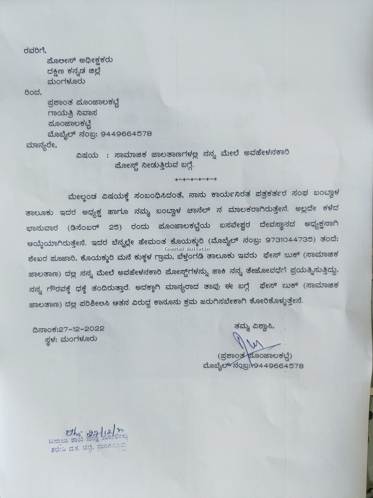 ಬಂಟ್ವಾಳ ತಾಲೂಕಿನ ಪತ್ರಕರ್ತರ ಸಂಘದ ಅಧ್ಯಕ್ಷ , ನಮ್ಮ ನ್ಯೂಸ್ ಚಾನೆಲ್ ನ ಮಾಲಕ ಪ್ರಶಾಂತ್ ಪುಂಜಾಲಕಟ್ಟೆ ಅವರ ಬಗ್ಗೆ ಬೆಳ್ತಂಗಡಿ ತಾಲೂಕಿನ ಕುಕ್ಕಳ , ಕೊಯಕ್ಕರಿ ನಿವಾಸಿ ಹೇಮಂತ ಎಂಬವರು ಸಾಮಾಜಿಕ ಜಾಲತಾಣದಲ್ಲಿ ಅವಹೇಳನಕಾರಿ ಸಂದೇಶ ಹಾಕಿ ಗೌರವಕ್ಕೆ ದಕ್ಕೆ ಮಾಡಿದ್ದಾರೆ ಎಂದು ಅವರು ಎಸ್.ಪಿ.ಗೆ ನೀಡಿದ ದೂರಿನಲ್ಲಿ ತಿಳಿಸಿದ್ದಾರೆ.