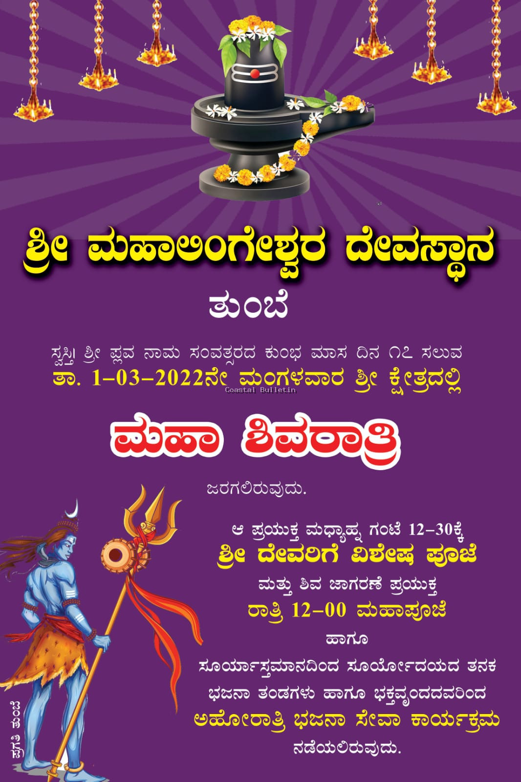 ಬಂಟ್ವಾಳ :ಇಲ್ಲಿನ ತುಂಬೆಯ ಪ್ರಸಿದ್ಧ ಶ್ರೀ ಮಹಾಲಿಂಗೇಶ್ವರ ದೇವಸ್ಥಾನದಲ್ಲಿ ಮಹಾಶಿವರಾತ್ರಿ ಪ್ರಯುಕ್ತ ದೇವರಿಗೆ ವಿಶೇಷ ಪೂಜೆ ಹಾಗೂ ಆಹೋರಾತ್ರಿ ಭಜನಾ ಸಂಕೀರ್ತನ ಕಾರ್ಯಕ್ರಮವು ಮಾ 1ರಂದು ಮಂಗಳವಾರ ನಡೆಯಲಿದೆ.