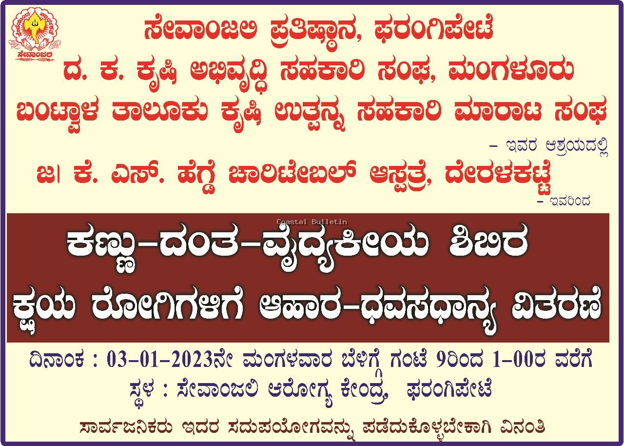 ಮಂಗಳೂರು : ಸೇವಾಂಜಲಿ ಪ್ರತಿಷ್ಠಾನ ಫರಂಗಿಪೇಟೆ ಇದರ ಆಶ್ರಯದಲ್ಲಿ ದ.ಕ.ಕೃಷಿ ಅಭಿವೃದ್ಧಿ ಸಹಕಾರಿ ಸಂಘ ಮಂಗಳೂರು, ಬಂಟ್ವಾಳ ತಾಲೂಕು ಕೃಷಿ ಉತ್ಪನ್ನ ಸಹಕಾರಿ ಮಾರಾಟ ಸಂಘ ಇವರ ಸಹಯೋಗದಲ್ಲಿ ಜ.ಕೆ.ಎಸ್.ಹೆಗ್ಡೆ ಚ್ಯಾರಿಟೇಬಲ್ ಆಸ್ಪತ್ರೆ ದೇರಳಕಟ್ಟೆ ಎ.ಬಿ.ಶೆಟ್ಟಿ ಇನ್ ಸ್ಟಿಟ್ಯೂಟ್ ಆಫ್ ಡೆಂಟಲ್ ಸಯನ್ಸ್ ದೇರಳಕಟ್ಟೆ ಇವರಿಂದ ಜ.3 ರಂದು ಕಣ್ಣು - ದಂತ - ವೈದ್ಯಕೀಯ ಶಿಬಿರ ನಡೆಯಲಿದೆ.