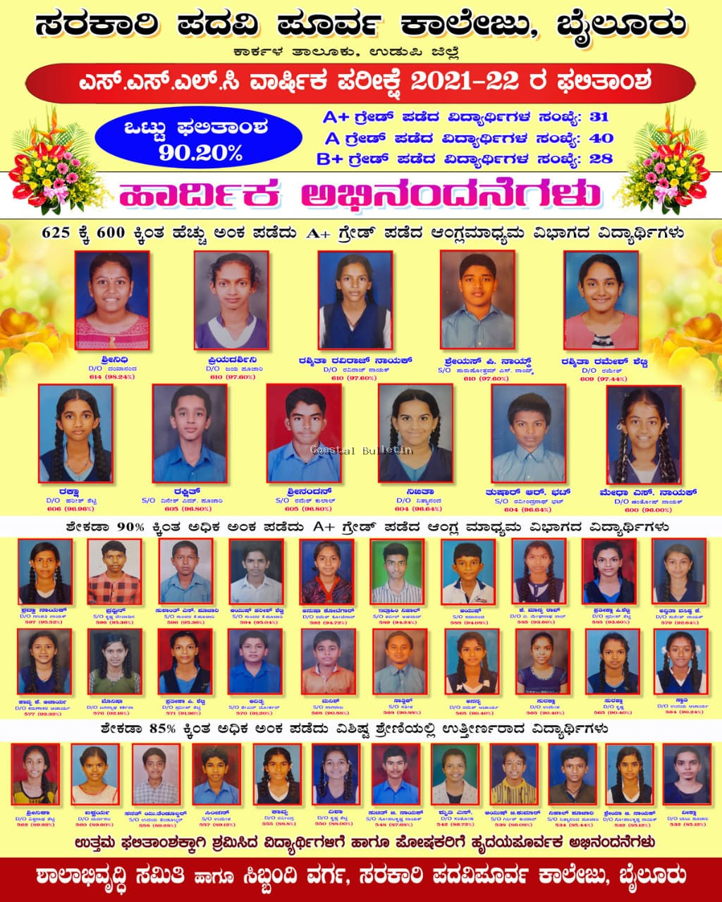 ತೇರ್ಗಡೆಯಾದ ವಿದ್ಯಾರ್ಥಿಗಳ ಹಾಗೂ ಉತ್ತಮ ಫಲಿತಾಂಶ ನೀಡಿದ ವಿದ್ಯಾರ್ಥಿಗಳು.