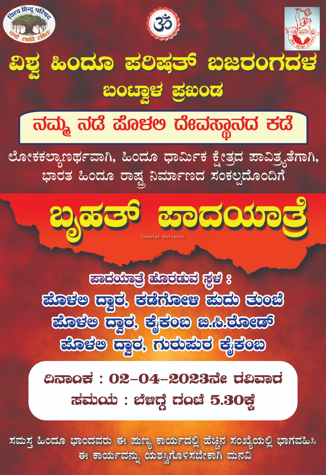 ಬಂಟ್ವಾಳ : ವಿಶ್ವ ಹಿಂದೂ ಪರಿಷತ್ ಬಜರಂಗದಳ ಬಂಟ್ವಾಳ ಪ್ರಖಂಡ ವತಿಯಿಂದ "ನಮ್ಮ ನಡೆ ಪೊಳಲಿ ದೇವಸ್ಥಾನದ ಕಡೆ" ಎಂಬ ಬೃಹತ್ ಪಾದಯಾತ್ರೆ ಎ.2ರಂದು ಆದಿತ್ಯವಾರರಂದು ನಡೆಯಲಿದೆ.