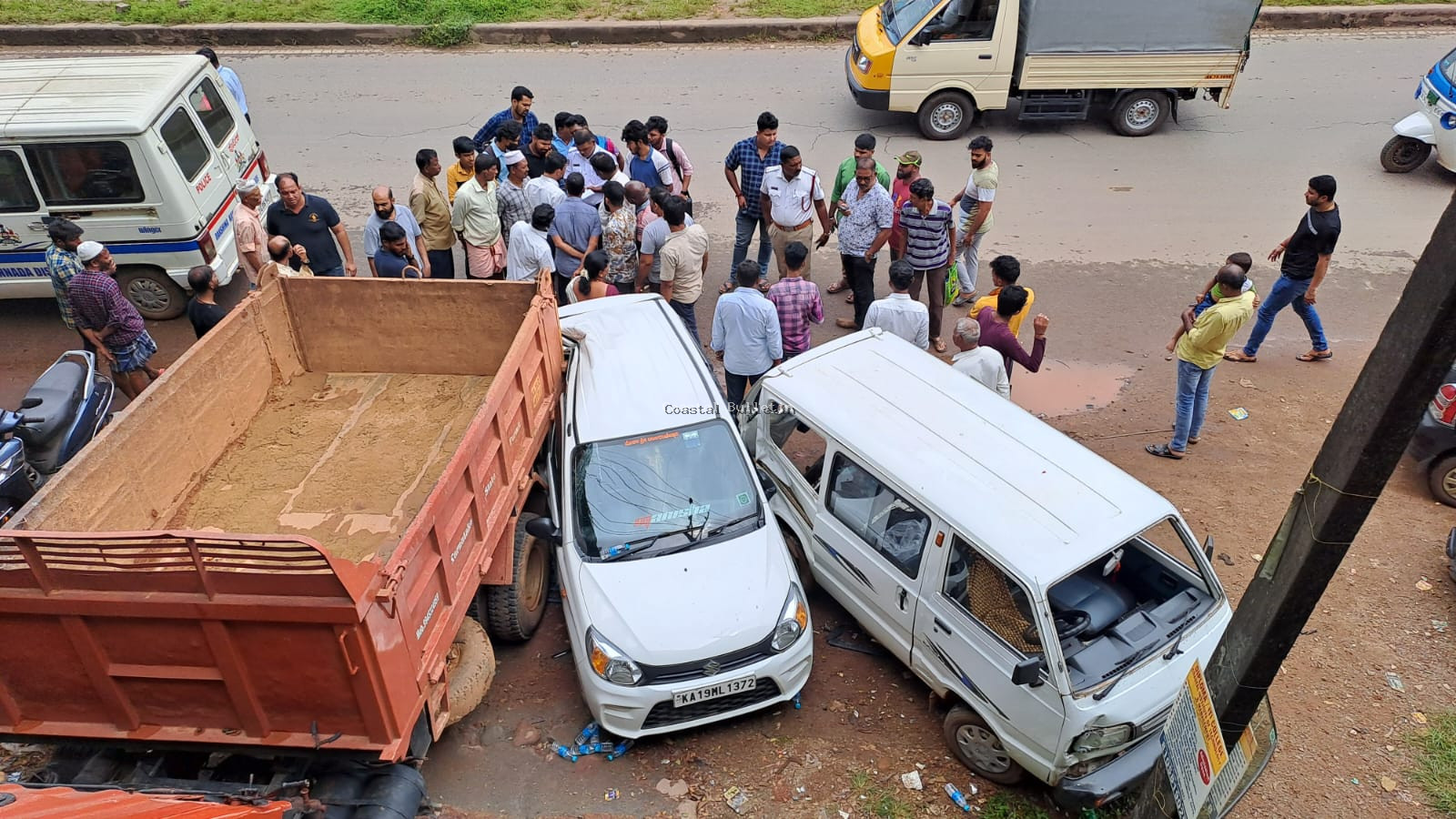 ಬಿಸಿರೋಡ್ ಕಡೆಯಿಂದ ಅತಿ ವೇಗದಲ್ಲಿ ಧಾವಿಸಿ ಬಂದ ಕಾರು ಕಾಂತಪ್ಪ ಪೂಂಜಾ ಸಂಕೀರ್ಣ ದ ಎದುರುಗಡೆ ನಿಲ್ಲಿಸಿದ್ದ ಓಮ್ನಿ 800ಮತ್ತು ಮಾರುತಿ ಆಲ್ಟೊ ಕಾರು ಹಾಗು ರಿಪೇರಿಗೆ