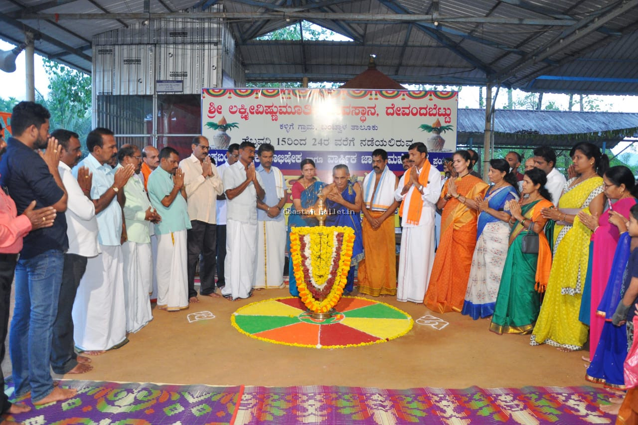 ಬಂಟ್ವಾಳ :ತಾಲೂಕಿನ ಕಳ್ಳಿಗೆ ಗ್ರಾಮದ ದೇವಂದಬೆಟ್ಟು ಶ್ರೀ ಲಕ್ಷ್ಮೀವಿಷ್ಣುಮೂರ್ತಿ ದೇವಸ್ಥಾನದ ಅಷ್ಟಬಂಧ ಬ್ರಹ್ಮಕಲಶದ ಪೂರ್ವಭಾವಿಯಾಗಿ 48 ದಿನಗಳ ಕಾಲ ನಡೆಯಲಿರುವ ಸಂಧ್ಯಾ ಭಜನಾ ಸಂಕೀರ್ತನೆಗೆ ಗುರುವಾರ ಸಂಜೆ ಅರ್ಚಕ ಶಿವರಾಮ ಶಿಬರಾಯ ಮತ್ತು ಉಷಾ ಶಿಬರಾಯ ದಂಪತಿಗಳು ದೀಪ ಬೆಳಗಿಸಿ ಚಾಲನೆ ನೀಡಿದರು.