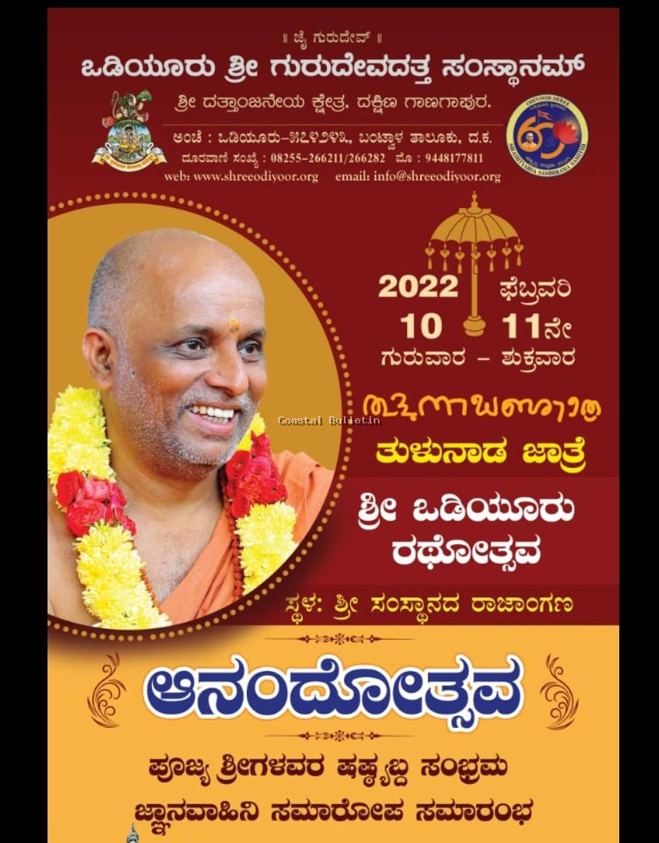 ಒಡಿಯೂರು: ಒಡಿಯೂರು ಶ್ರೀ ಗುರುದೇವದತ್ತ ಸಂಸ್ಥಾನಮ್, ದತ್ತಾಂಜನೇಯ ಕ್ಷೇತ್ರ ದಕ್ಷಿಣ ಗಾಣಗಾಪುರದ ಶ್ರೀ ಸಂಸ್ಥಾನದ ರಾಜಾಂಗಣದಲ್ಲಿ ದಿನಾಂಕ: 10-02-2022 ರಿಂದ 11-02-2022 ರವರೆಗೆ ತುಳುನಾಡು ಜಾತ್ರೆಯಾದ ಶ್ರೀ ಒಡಿಯೂರು ರಥೋತ್ಸವ ಬಹಳ ವಿಜೃಂಭಣೆಯಿಂದ ನಡೆಯಲಿದೆ.