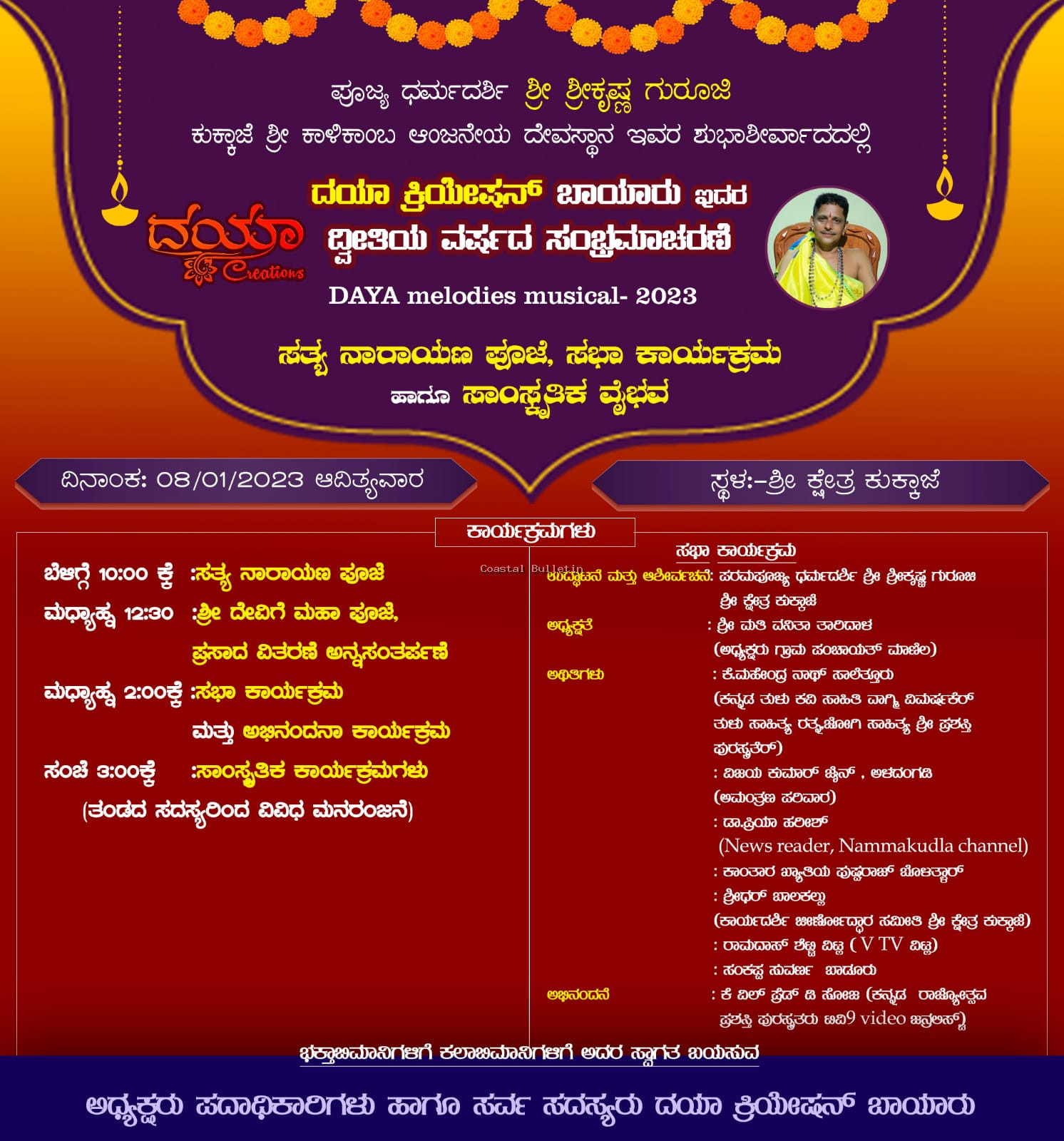 ಕುಕ್ಕಾಜೆ : ದಯಾ ಕ್ರಿಯೇಷನ್ ಬಾಯಾರು ಇದರ ದ್ವೀತಿಯ ವರ್ಷದ ಸಂಭ್ರಮಾಚರಣೆಯ ಅಂಗವಾಗಿ ಜ.8 ರಂದು ಸತ್ಯ ನಾರಾಯಣ ಪೂಜೆಯು ಶ್ರೀ ಕ್ಷೇತ್ರ ಕುಕ್ಕಾಜೆಯಲ್ಲಿ ನಡೆಯಲಿದೆ.