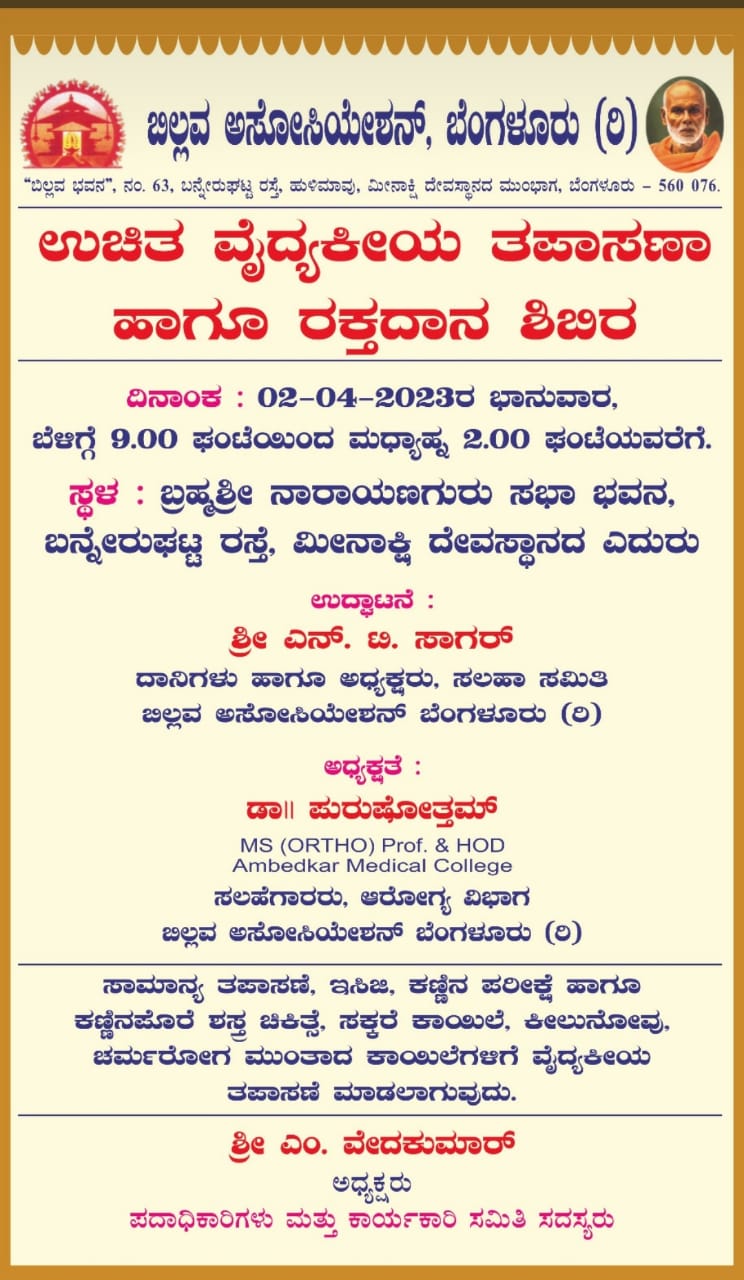ಬೆಂಗಳೂರು : ಬಿಲ್ಲವ ಅಸೋಸಿಯೇಷನ್ ಬೆಂಗಳೂರು (ರಿ) ಇದರ ವತಿಯಿಂದ ಉಚಿತ ವೈದ್ಯಕೀಯ ತಪಾಸಣಾ ಹಾಗೂ ರಕ್ತದಾನ ಶಿಬಿರವು ಎ.2 ರಂದು ನಡೆಯಲಿದೆ.